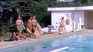 A gang of naturist have fun in an outdoor swimming pool.