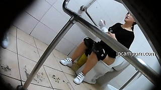 Cute white teen girl in black nylon pantyhose pees in the toilet