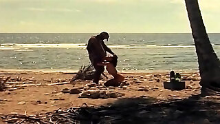 Molten dark-haired MILF gives head to her boy on rocky beach